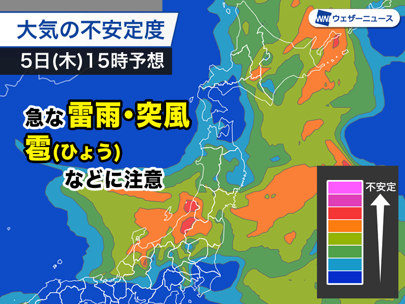 新潟県三条のアメダスでは、1時間に10mmのやや強い雨を観測しました。大気の不安定な状態は午後も継続するため、強い雨だけではなく、落雷や霰(あられ)にも注意が必要です。