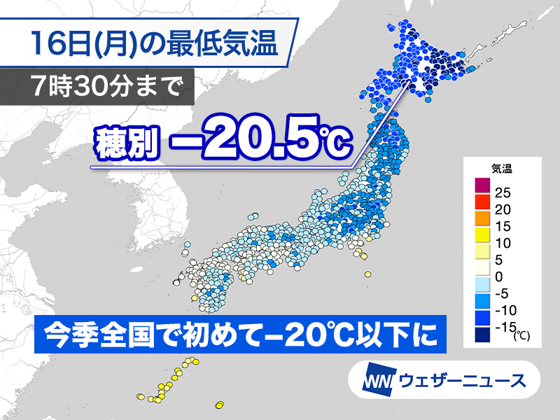 北海道胆振地方のアメダス穂別では−20.5℃まで下がり、今季全国で初めて−20℃以下の気温を観測しました(富士山頂除く)。札幌でも今季の最低気温を更新しています。