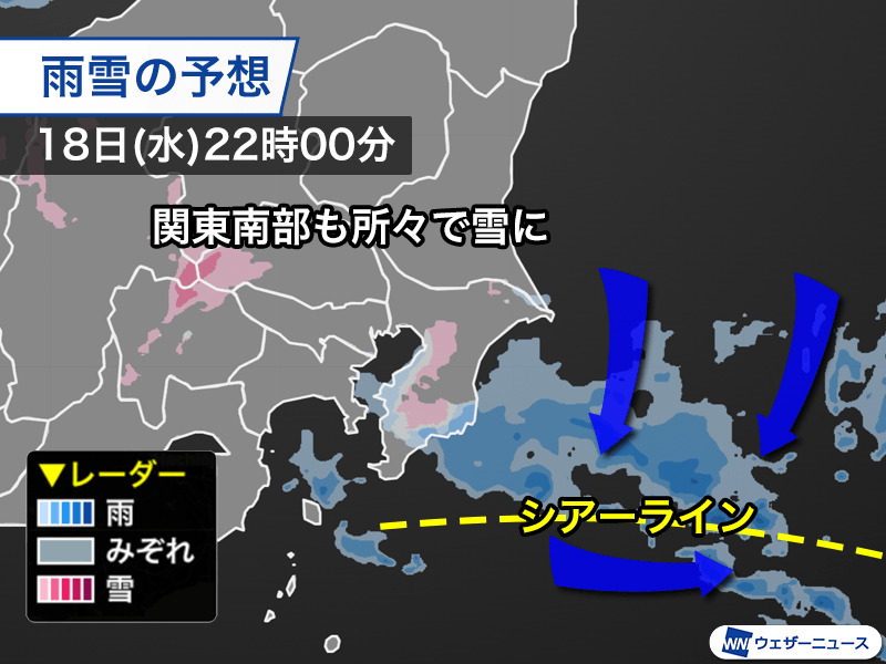 今夜は関東の東の海上を北寄りの風と西寄りの風がぶつかることで形成されるシアーラインが南下します。シアーラインの周辺は雲が発生しやすく、強い寒気の南下や気圧の谷の接近が加わることで、雨や雪を降らせるくらいになる見込みです。