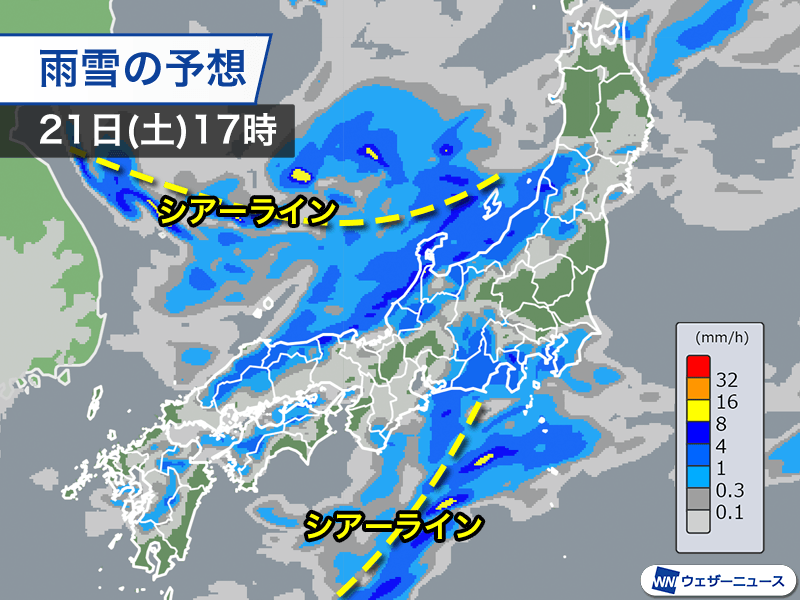 午後はシアーラインの南下に伴って北陸から山陰にかけて雨や雪の強まる所があります。活発な雲の周辺では雨が強まり、雷や霰(あられ)を伴う見込みです。風も強く荒れた天気となるため注意をしてください。