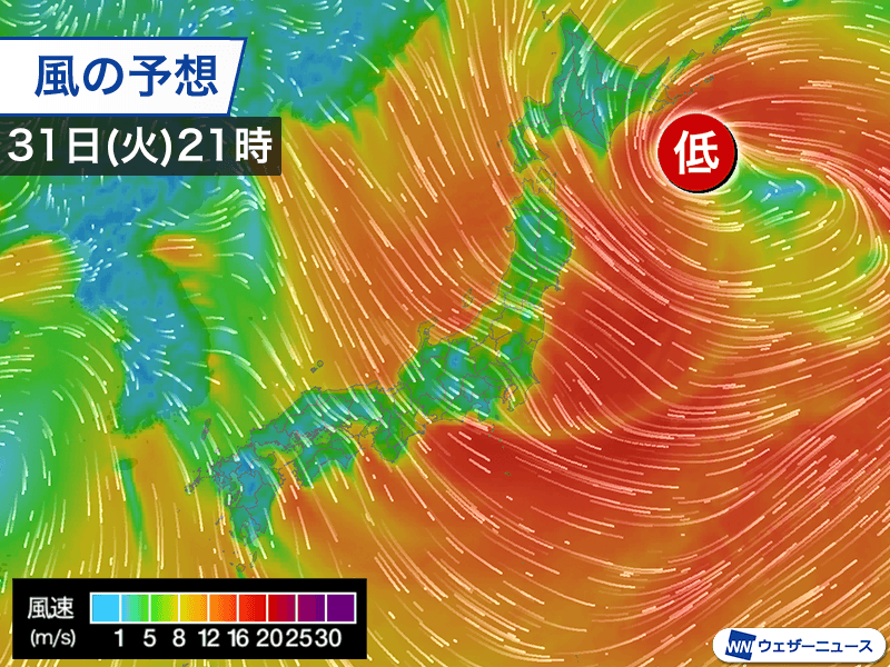 今日31日(火)は前線を伴った低気圧が発達しながら北日本を通過し、夜には北海道の東に達する見込みです。低気圧や前線の通過によって、北日本から北陸で雪や雨の降る所が多くなります。
