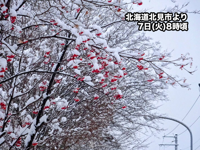 発達した低気圧が三陸沖から北海道の南の海上を東へ進んでいます。南から暖かい空気を運んできているため、北海道でも昨夜の降り始めは雨のところがありました。夜遅くからは雪に変わり、今朝は道東を中心に湿った雪となっています。