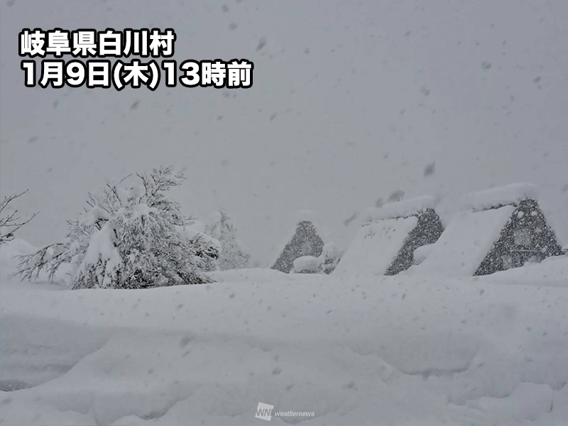 今日9日(木)14時までの24時間に岐阜県白川村で45cmの雪が降り、積雪は166cmとなっています。中国山地でも昨日から30cm前後の新たな雪が降ったところがありました。