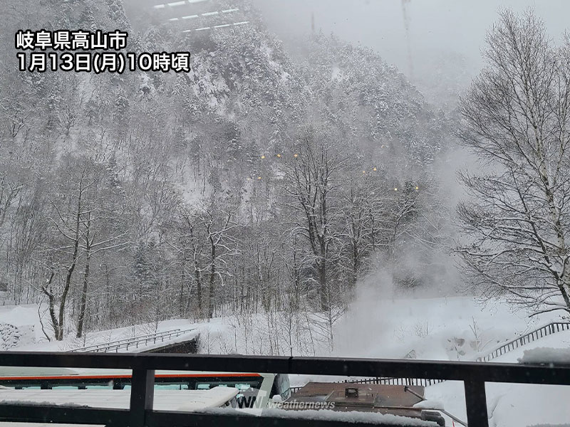 今日10時までの12時間に、岐阜県白川村22cm、福井県大野市九頭竜20cm、滋賀県長浜市柳ケ瀬で13cmの新たな雪が降りました。北陸から岐阜県、滋賀県にかけての山間部では昨夜からまとまった雪となったところがあります。