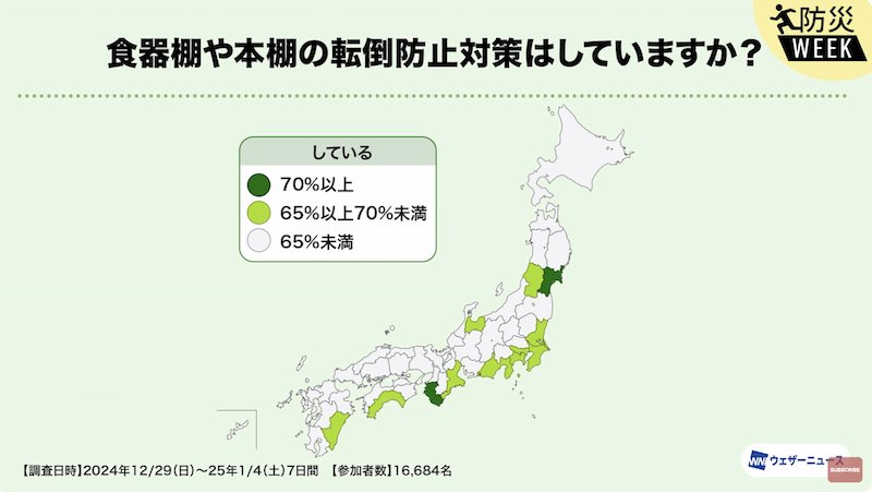 サンシャインの時間では震度と揺れの状況や、その震度で想定される被害などを知り、その被害を防ぐための「家具類の転倒・落下防止策における6つポイント」についてご紹介しました。
