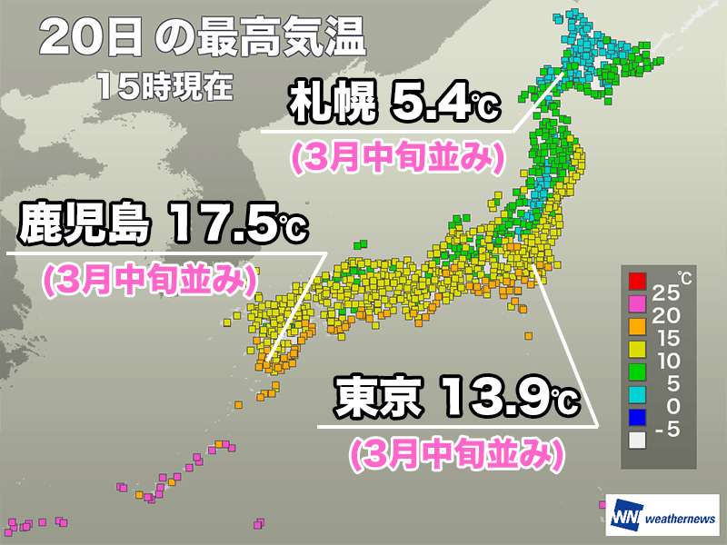 15時00分までの最高気温は西日本から東海、関東で15℃前後まで上がり、鹿児島市は17.5℃、東京都心は13.9℃といずれも3月中旬並みの陽気です。ウェザーニュースアプリ利用者からの体感報告では「ちょうどいい」や「暖かい」が目立っています。