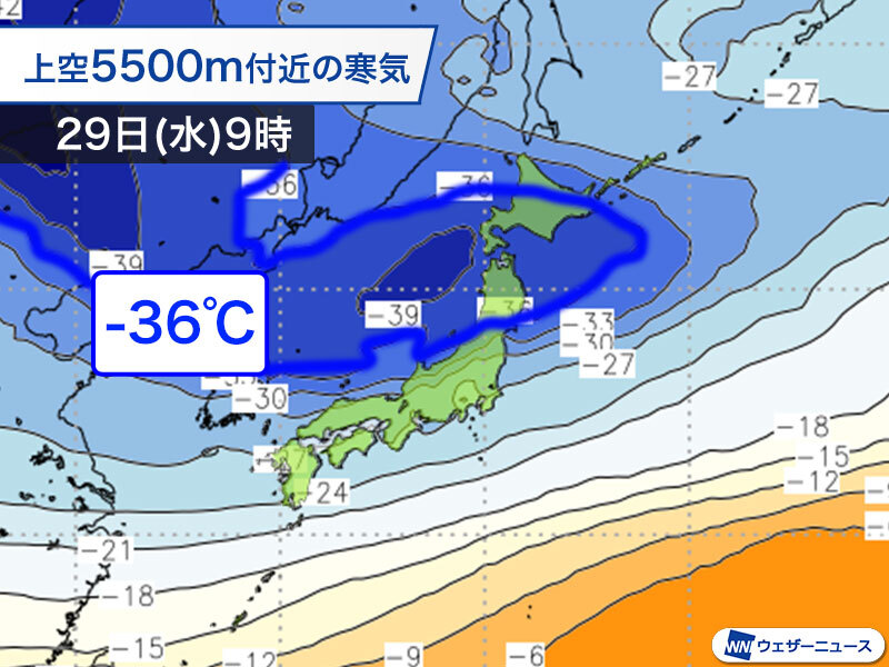 29日(水)から30日(木)にかけて、大雪の目安となる上空約5000mで−36℃以下の強い寒気が日本海から北日本方面に広がる見込みです。