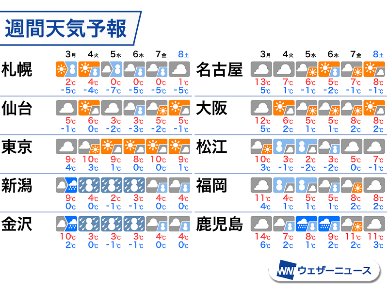 晴れる関東も最高気温が10℃以下の日が多く、朝晩は都市部でも0℃くらいまで下がるとみられます。