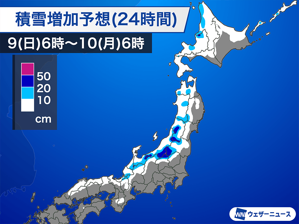 今日いっぱいは雪の降りやすい状況が続き、内陸部や山沿いの多い所ではさらに20〜30cmの雪が積もる見込みです。一連の寒波ですでに大雪になっているため、路面状況の悪化や屋根からの落雪、山間部での雪崩などに引き続き十分注意してください。