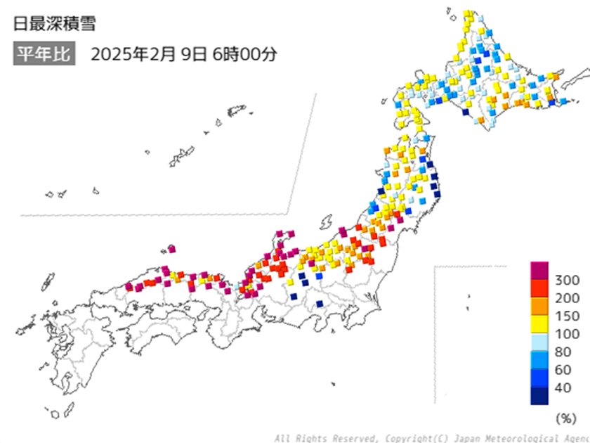 また、JPCZ(日本海寒帯気団収束帯)の周辺で雪雲が発達し、北陸や東北南部での大雪が目立ちました。7日(土)には福島県会津若松市の積雪が121cmに達し、1953年の観測開始以来、最も多くなっています。