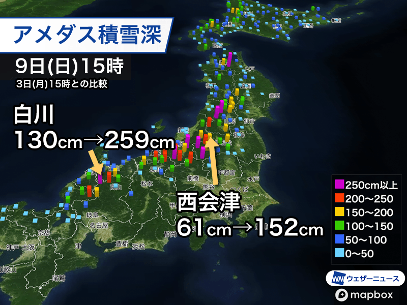 今回の寒波は1週間近くにわたって続いたこともあり、各地で積雪が大きく増えました。すでに多くの雪が積もっていた内陸部や山沿いで倍増するほどです。3日(月)15時の時点で積雪130cmだった岐阜県白川村は259cmとほぼ2倍、61cmだった福島県西会津町は152cmと2.5倍に増えました。