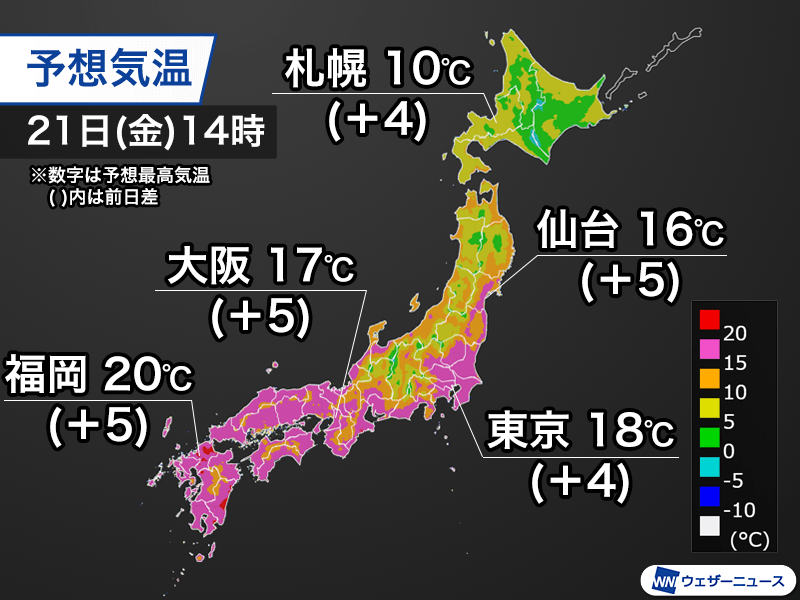 九州には20℃以上の赤色の領域が見られ、福岡市の最高気温は今月2日以来の20℃以上となる予想です。大阪市や東京都心、仙台市なども今日に比べて5℃前後高く、各地で4月並みの暖かさとなります。