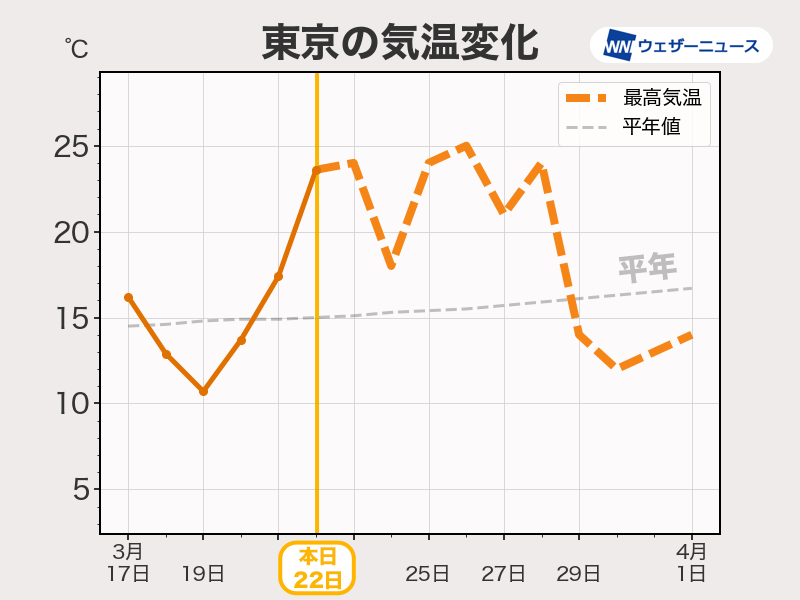 暖かさ続き東京で夏日の可能性も 次の週末は一転し全国的に気温低下