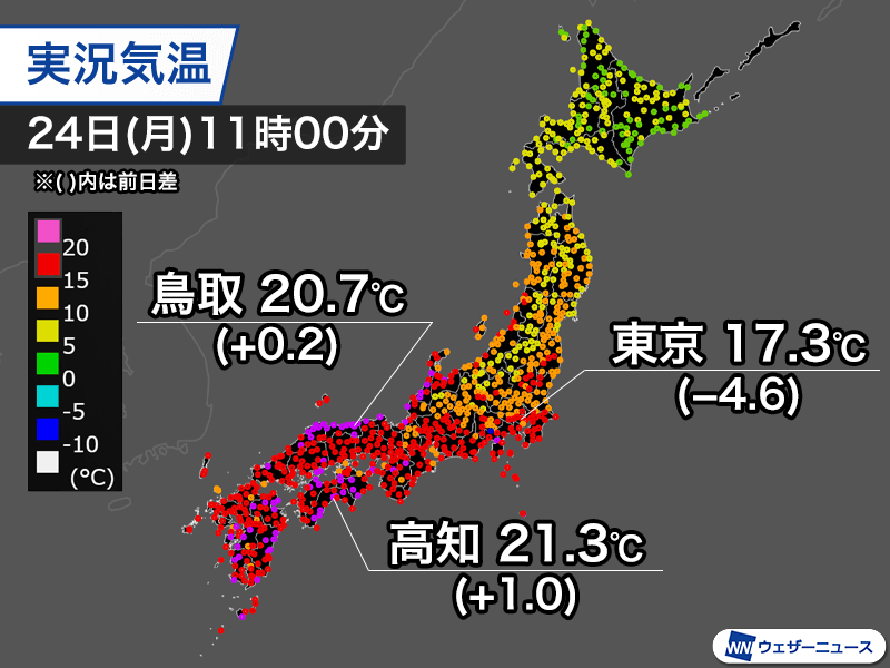 それでも西日本ではすでに20℃を上回っている所があり、季節先取りの陽気は継続中です。11時00分の気温は高知市で21.3℃、鳥取市で20.7℃を観測しています。東京都心は昨日の同じ時間に比べて5℃ほど低く17.3℃です。