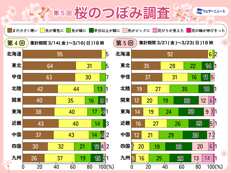 23日(日)に高知と熊本で開花発表がありましたが、前回と比較しても、西日本や東日本は「先がピンクに」以上のつぼみが増えており、開花に向けて生長が進んでいるのが分かります。