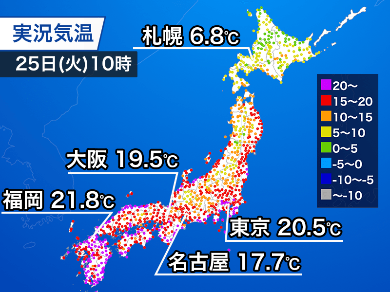 今日25日(火)10時の気温は、大阪19.5℃、名古屋17.7℃、東京20.5℃となっています。昨日、雲の多かった関東から近畿は昨日より2〜5℃くらい高めです。