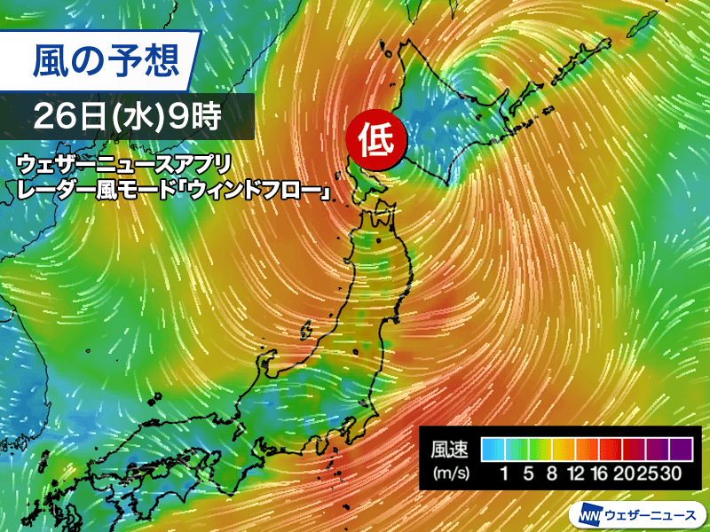 また、低気圧の発達に伴って風も強まります。沿岸部を中心に瞬間的に20m/sを超えるような強風となるため注意が必要です。