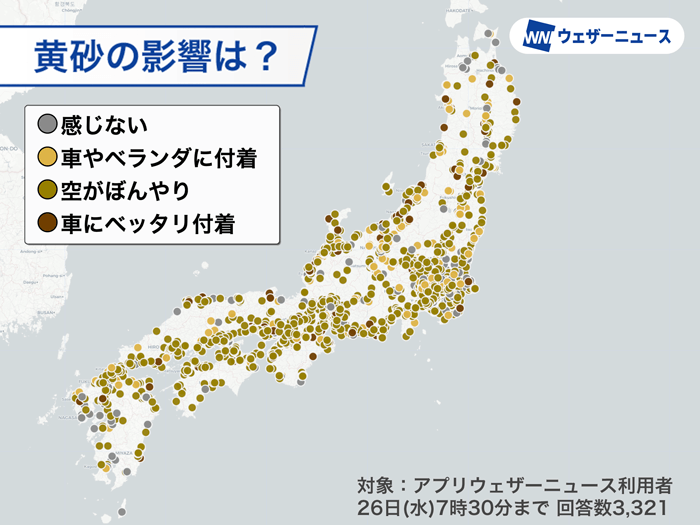 ウェザーニュースアプリ利用者に黄砂の影響についてアンケート調査を実施したところ、今朝7時30分時点で3321人からの回答がありました。調査の結果、空がぼんやりしているとう回答が最も多く約60%以上となり、ベランダや車への黄砂の影響も合わせると約85%の方が、黄砂の影響を実感している結果となっています。東北から九州の広範囲で黄砂が飛来していることがわかります。