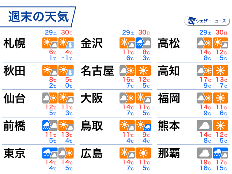 西日本は日曜日によく晴れますが気温は低く、最高気温は福岡市が11℃、熊本市と高知市は12℃の見込みです。朝晩は冷え込むため夜桜見物は特に防寒をしっかりと行ってください。