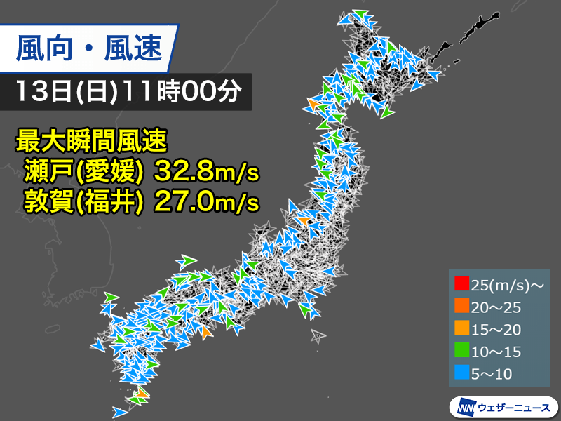 九州以外の西日本や北日本の日本海側でも風が強まっていて、11時00分までの最大瞬間風速は、愛媛県伊方町・瀬戸で32.8m/s、福井県敦賀市で27.0m/sを観測しました。北海道檜山地方はさらに風が強まる見通しで、暴風警報を発表しています。