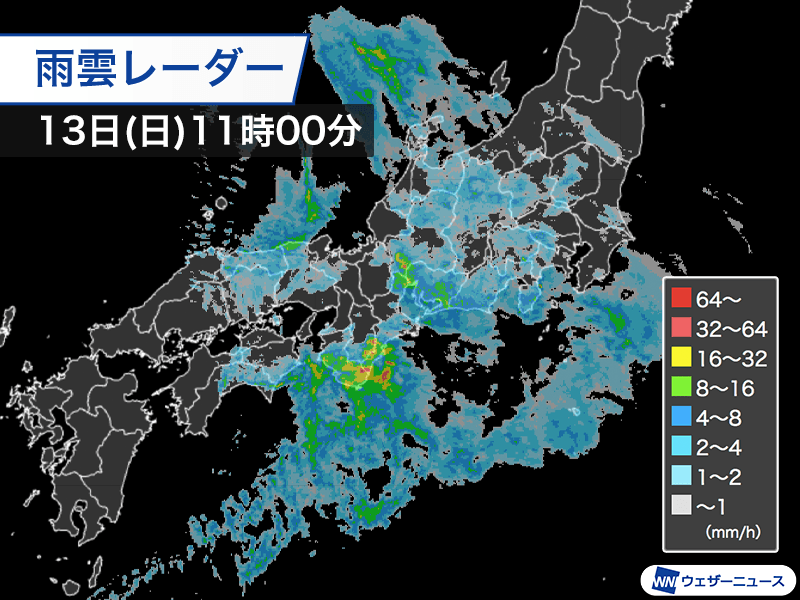 低気圧や前線に伴う雨雲は四国から東海、関東にかけて広がっています。南から湿った空気が流れ込んでいる影響で太平洋側では雨雲が発達し、11時00分までの1時間には高知県室戸市・佐喜浜で12.5mm、和歌山県串本町・潮岬では13.5mmのやや強い雨を観測しました。