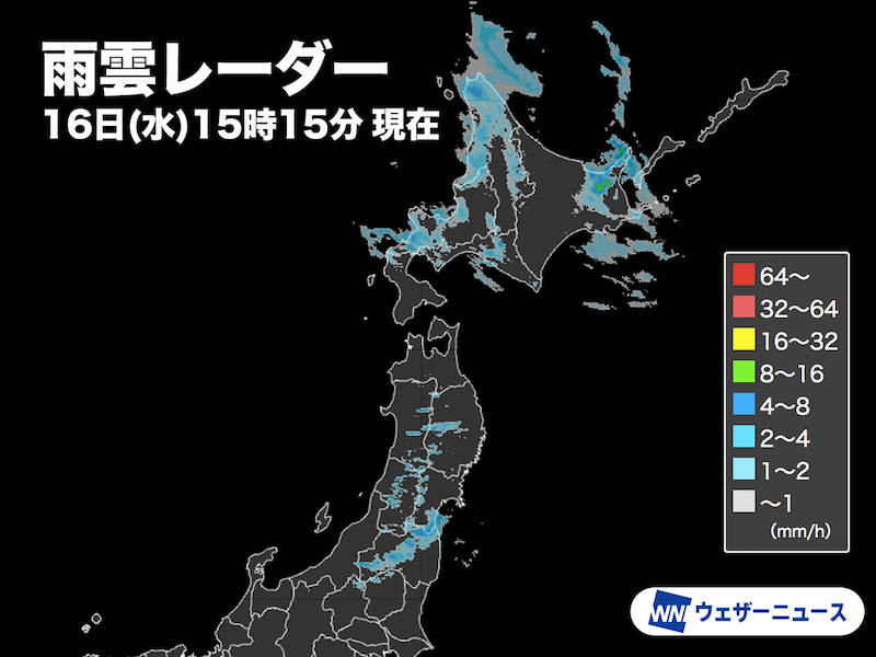 今日16日(水)は、上空に寒気を伴った低気圧が北海道付近を通過しています。北日本各地で雨や風が強まり荒れてた天気となり、東北南部や新潟では雹や霰も降りました。東北は今夜遅く、北海道は明朝にかけて強い雨や風に注意が必要です。