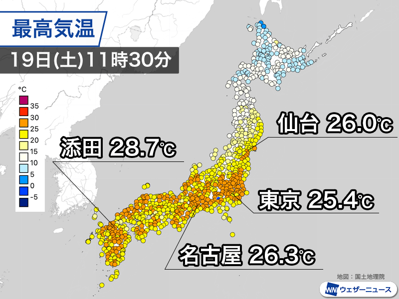 今日19日(土)は西日本、東日本に暖かな空気が流れ込み、東京都心や名古屋市など午前中から25℃以上の所が多くなっています。午後はさらに気温が上昇し、30℃前後の所が増えますので、熱中症にご注意ください。