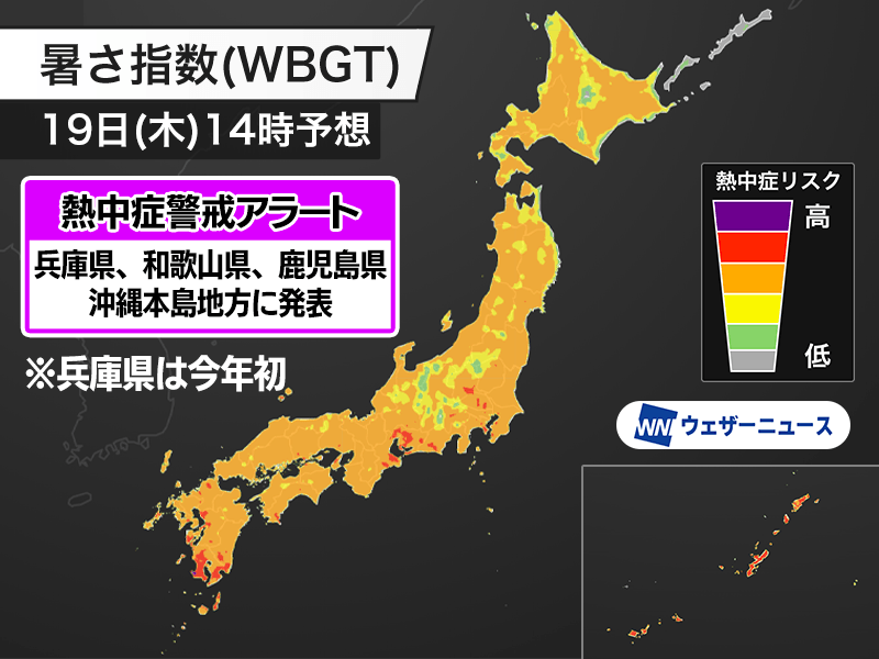 環境省と気象庁は、今日6月19日(木)を対象とした熱中症警戒アラートを兵庫県、和歌山県、鹿児島県(奄美地方除く)、沖縄本島地方の4地域に発表しました。