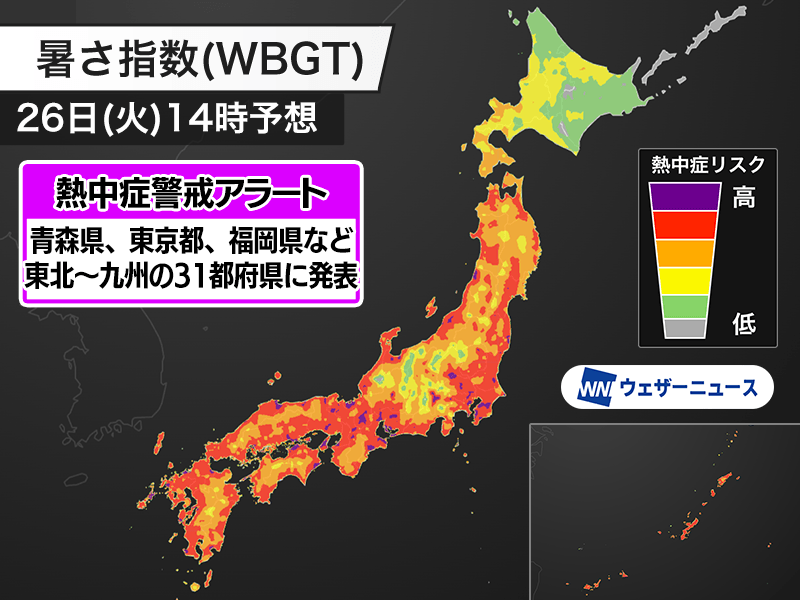 今日8月26日(火)の熱中症警戒アラート 東北〜九州の31都府県に発表