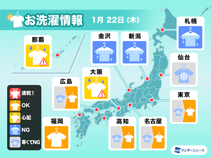 気温も低く最高気温が10℃下回る地点がほとんどになる見込みです。外干ししても乾くまでに時間がかかりそうです。