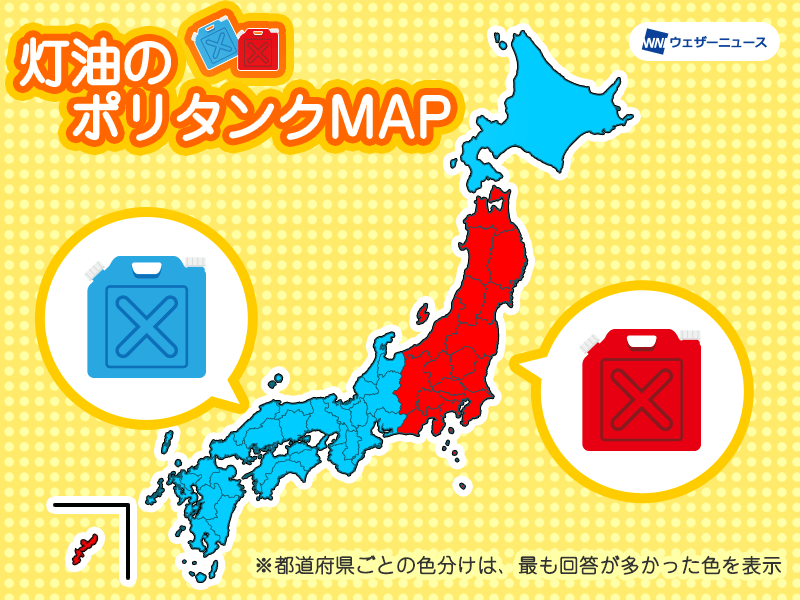 ウェザーニュースでは、全国の皆さんに灯油用ポリタンクの色の調査を実施。「赤、青、赤や青(混ざっている)、その他」の4択で回答して頂きました。