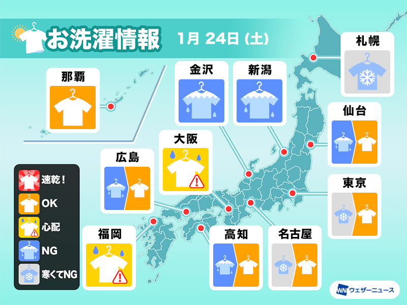 1月24日(土)の洗濯天気予報 広い範囲で部屋干し推奨