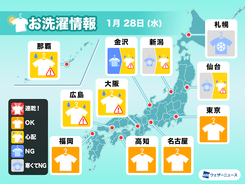 1月28日(水)の洗濯天気予報 関東や東海、九州はカラッとお洗濯日和