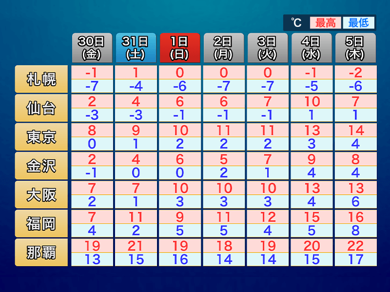 その後は寒波の影響で寒さが続いていて、これから週末にかけても平年並みか低めの傾向が継続する見込みです。最高気温は10℃に届かない日が多く、最低気温は0℃近くまで下ります。