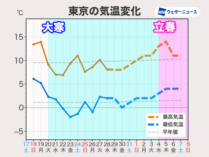 東京都心の気温の推移を見ると、”大寒”になるとともに、それまでの季節外れの陽気から一気に真冬の寒さへと変化しました。