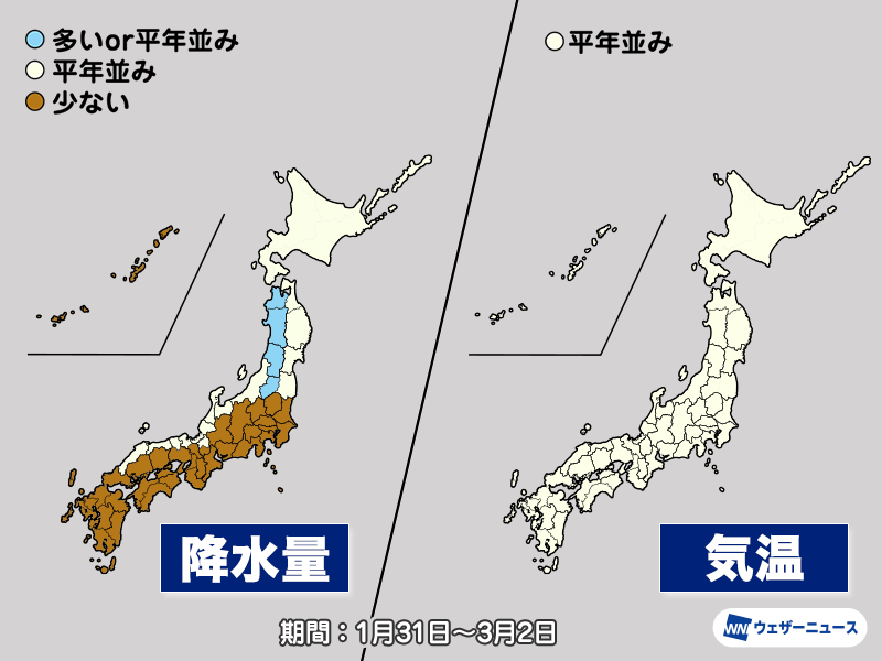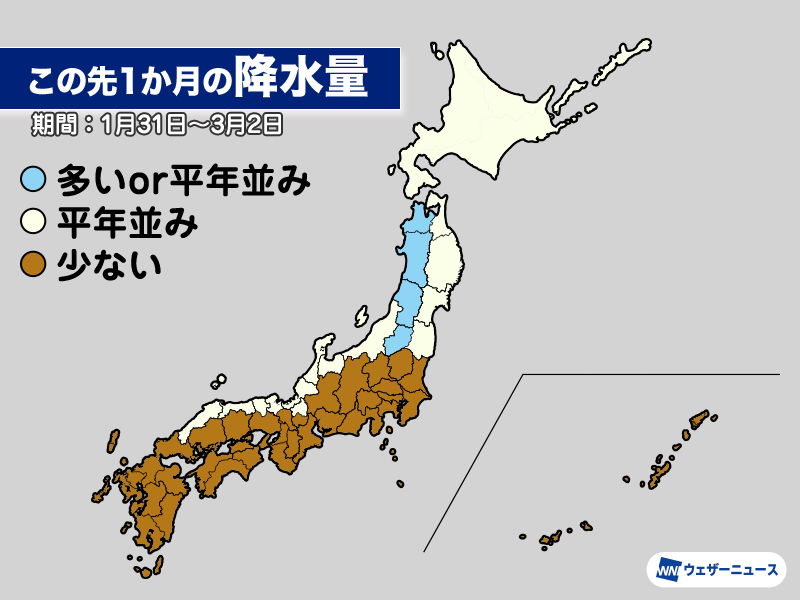 関東から西日本の太平洋側は高気圧に覆われやすく、降水量は平年よりも少ない予想です。名古屋市や京都市、高知市など1月の降水量が0.0mmという所があり、空気の乾燥した状態が続くとみられます。
