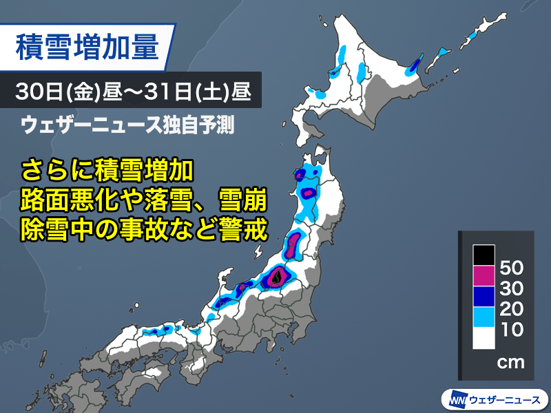 これから明日昼までの24時間の積雪増加量は、北陸、東北の山沿いで30cm以上、標高の高い地域では50cm前後に達する予想となっています。山陰や近畿北部でも山沿いではさらに20cmの雪が積もる見込みです。