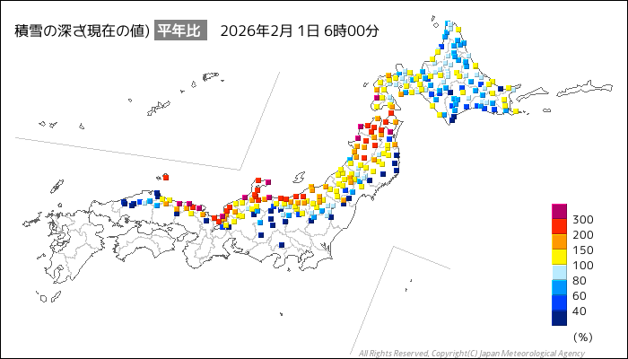 1月下旬の寒波などで日本海側では広範囲で積雪が増えたことで、平年の同時期と比べて積雪深(地面からの雪の厚み)が多くなっています。図中の黄色よりも暖色系のところは平年の100%以上となっている地点で、赤色の所は200%以上になっている状況です。
