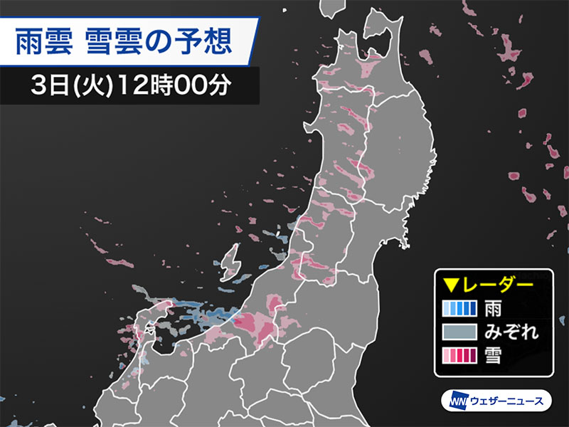 今日3日(火)も日本海側を中心に断続的に雪が降っています。午後にかけて雪のエリアは縮小傾向ですが、これまでの大雪の影響もあるため、引き続き注意が必要です。
