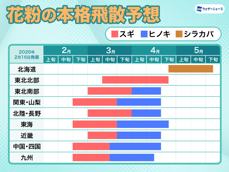 この後は、3月中旬にかけて東北北部などの各地でも飛散が始まり、北海道のシラカバ花粉は4月下旬からの飛散になるとみています。