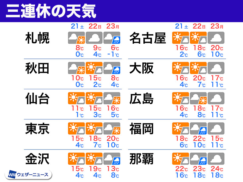 三連休は前半ほどお出かけ日和 気温も上がり快適な陽気に