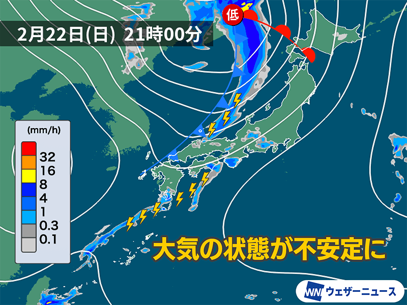 今日は大陸沿岸を北東進する低気圧から伸びる寒冷前線が日本海を東進し、低気圧や前線に向かって暖かく湿った空気が流れ込むため大気の状態が不安定となります。また、東シナ海は気圧の谷となっていて、シアーラインと呼ばれる場所で帯状に雨雲が発生しています。