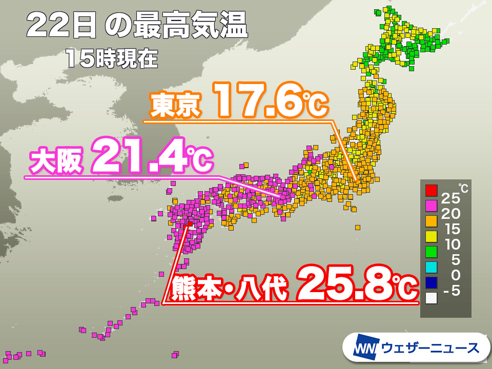 最高気温の分布をみると西日本や北陸で20℃を上回った地点が多くなっています。大阪(21.4℃)や金沢(20.9℃)も今年一番の暖かさです。北日本や西日本では今年一番の暖かさとなった地点が多くなりました。東京の最高気温は17.6℃でした。