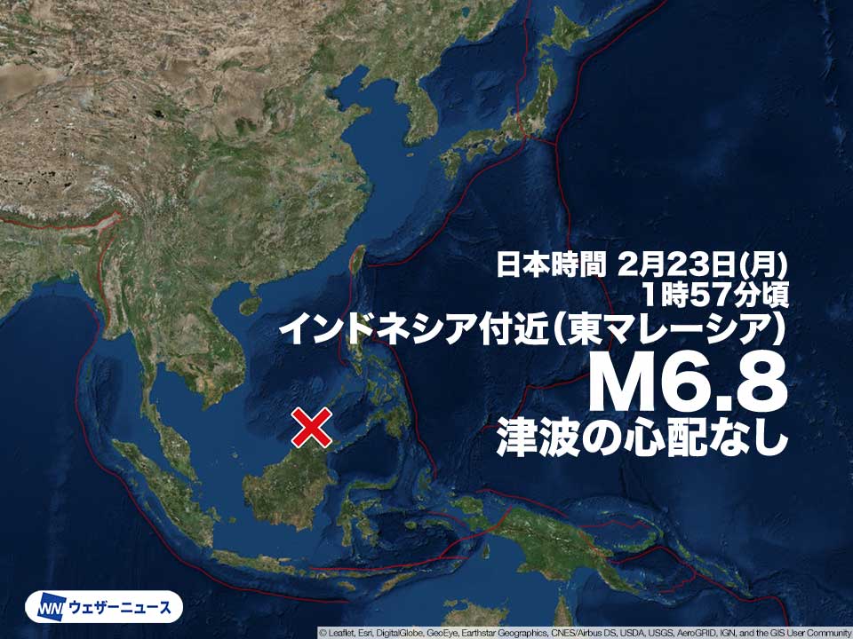 日本時間の2月23日(月)1時58分頃、海外で地震がありました。震源地は東マレーシア(インドネシア付近/カリマンタン)で、震源の深さは約600km、地震の規模(マグニチュード)は6.8と推定されます。