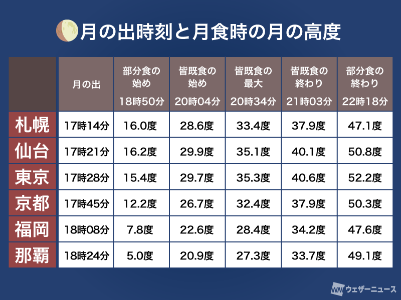 皆既月食は、満月が地球の影になる空間を通過するときに光が失われ赤銅色になる現象で、全国どこでも同じタイミングで起こります。