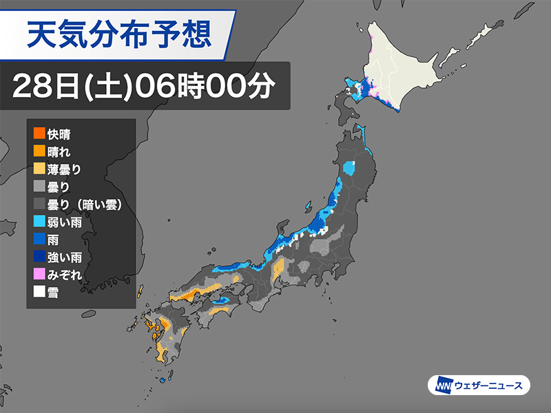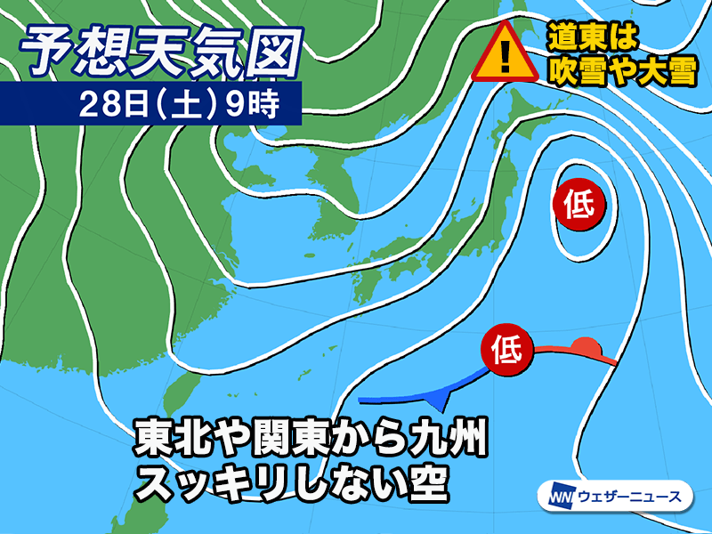 27日(金)から28日(土)にかけて、低気圧が発達しながら日本の東海上を北北東に進みます。このため、北海道の道東では雪や風の強まるおそれがあります。