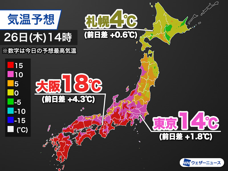 最高気温は東京都心は14℃、仙台は6℃の予想で、昨日よりも気温が上がる所が多いですが、日差しが少ない分だけ昼間も空気が冷たく感じられそうです。