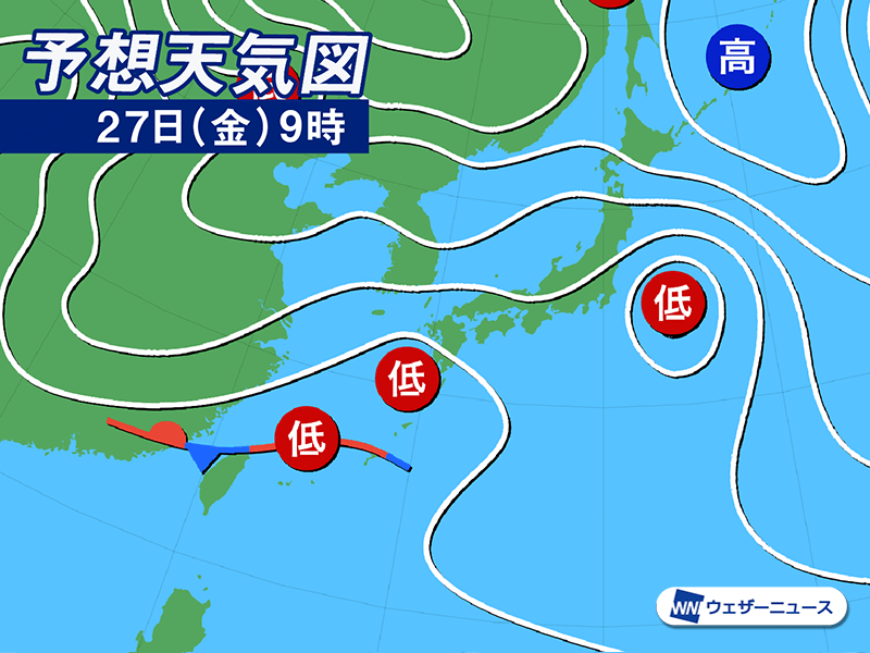 低気圧や前線が近づくため、九州や沖縄では午前中に雨が降り出します。午後になると中国や四国にも雨の範囲が広がる見込みです。九州の沿岸部と沖縄では一時的に雨の強まる可能性があります。