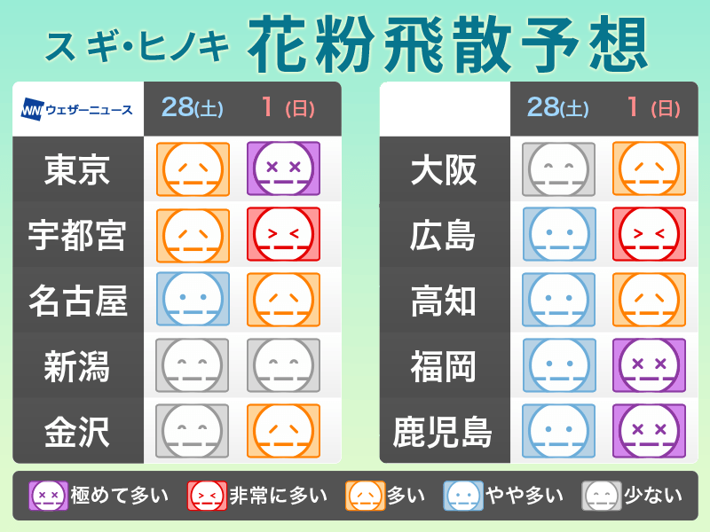 28日(土)は東京や宇都宮で「多い」ランクで、九州や中国、四国は「やや多い」ランクとなっています。3月1日(日)は東京、福岡、鹿児島で「極めて多い」ランクが予想され、大量飛散があってもおかしくありません。
