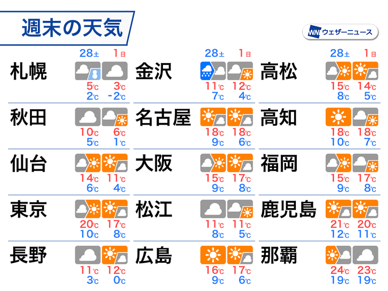 週末は次第に高気圧が日本列島を覆ってきます。明後日28日(土)は西日本、東日本の太平洋側を中心に晴れる所が多く、3月1日(日)は北陸や北日本でも晴れる所が増える見込みです。